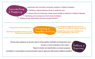 The Faith & Belief Forum, with partners Why Me? and Interfaith Glasgow, are exploring how Restorative Justice practices can be applied to address hostility against and between faith communities in Solihull and Glasgow.