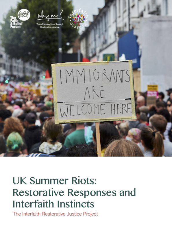 Restorative Responses & Interfaith Instincts is a report focussed on responses to the UK Summer Riots and unrest in 2024. It is produced by the Interfaith Restorative Justice Project (IRJP), a partnership between The Faith & Belief Forum, Interfaith Glasgow, and Why me?.